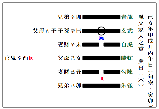 财爻持世比合日,应爻六合世爻,应爻月克,合生日辰,人气还是有问题。朱雀官鬼午火动化官鬼酉金,此卦反映的应是向前别墅的三角火星,在饭店门前挂凸面镜化解。改门并改收银台位置后,第二天饭店就来了五六桌客人了,老板就有了信心,说比原来好了许多,但感觉还是人气还是差很多,遂再用易: