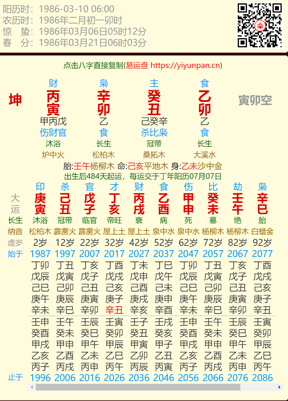 本帖最后由 达子的春天 于 2019-11-18 20:21 编辑 排盘方式:真太阳时排盘 清明:1980年04月04日23时15分 福德四柱八字排盘系统 立夏:1980年05月05日16时44分 起运:命主于出生后4年8个月0天12小时开始起运 交运:命主于公历1984年12月19日11时交运 枭神 枭神 日主 枭神 坤造: 庚 ...